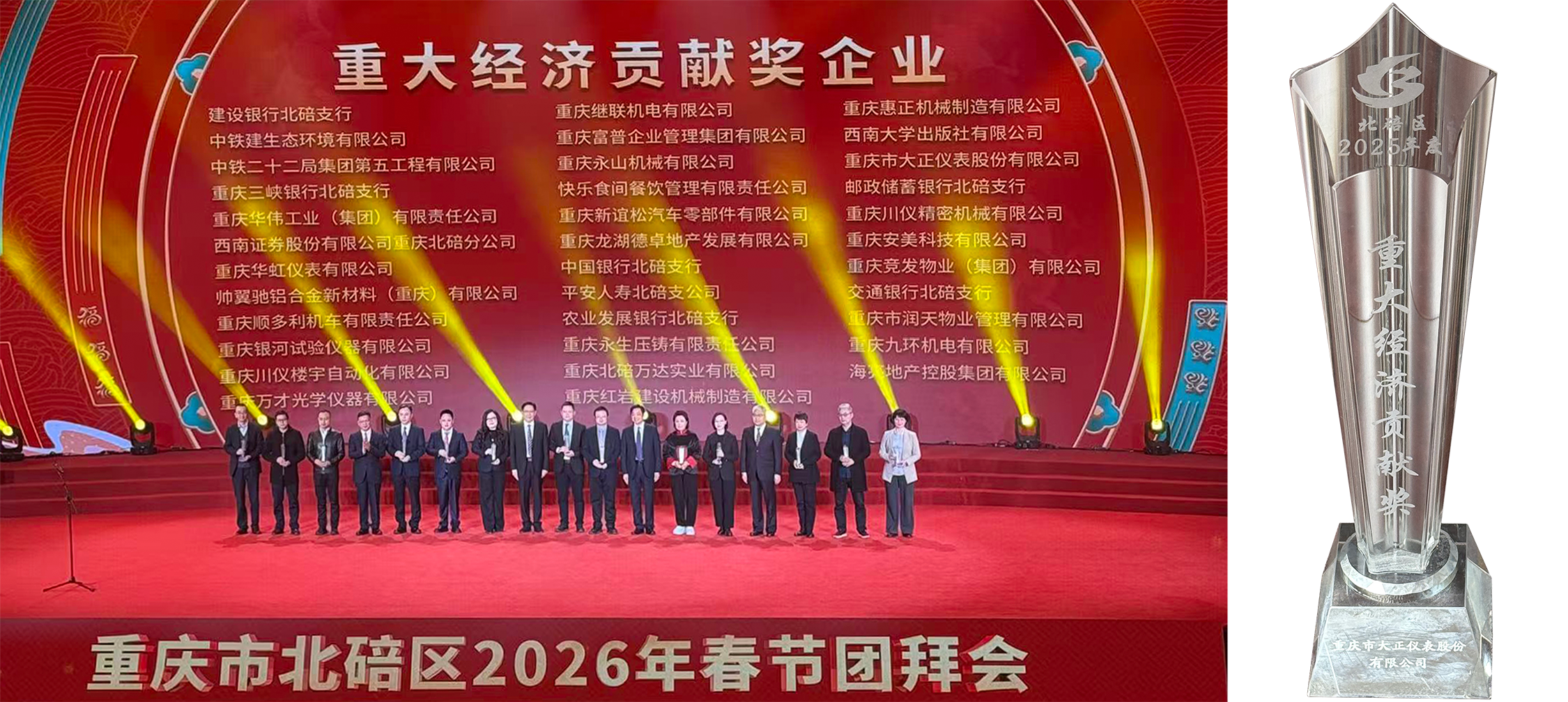 2026年2月12日,重庆市北碚区2026年春节团拜会隆重举行。在这场全区共庆新春、共话发展的盛会上,大正仪表再次荣获北碚区2025年度“重大经济贡献奖”。在会上,公司董事长周洪琴还与另外两位企业家共同表演了自创的配乐诗朗诵《春日国书》,以铿锵之声传递企业家家国情怀,赢得现场热烈掌声。